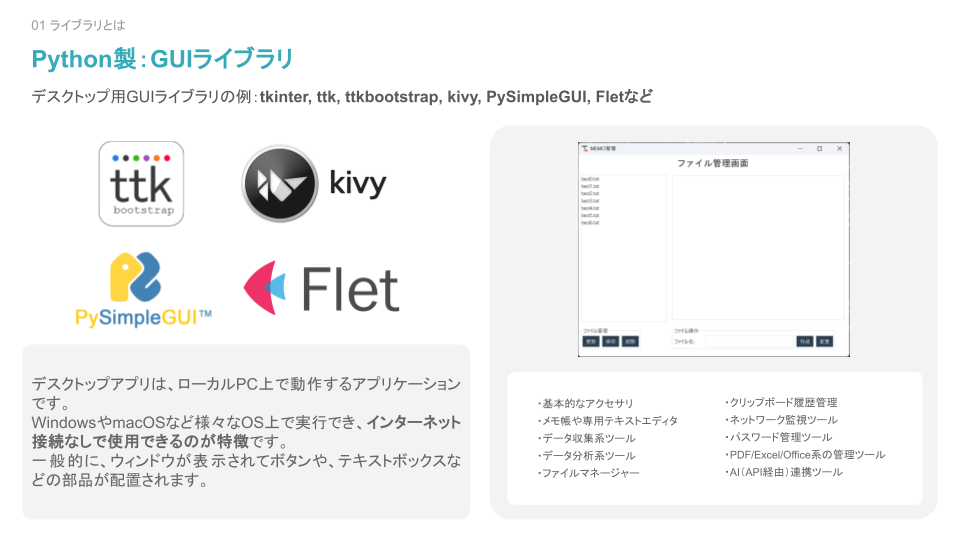 - Tkinterなどを利用したデスクトップアプリ開発記事も掲載