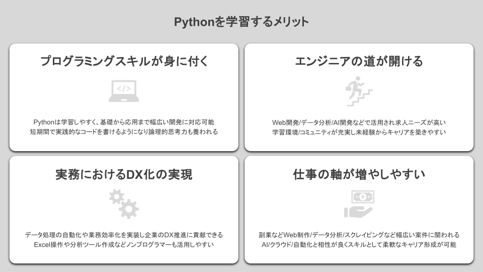 Job Codeでは、Pythonをはじめ関連する技術の学習も用意しています。